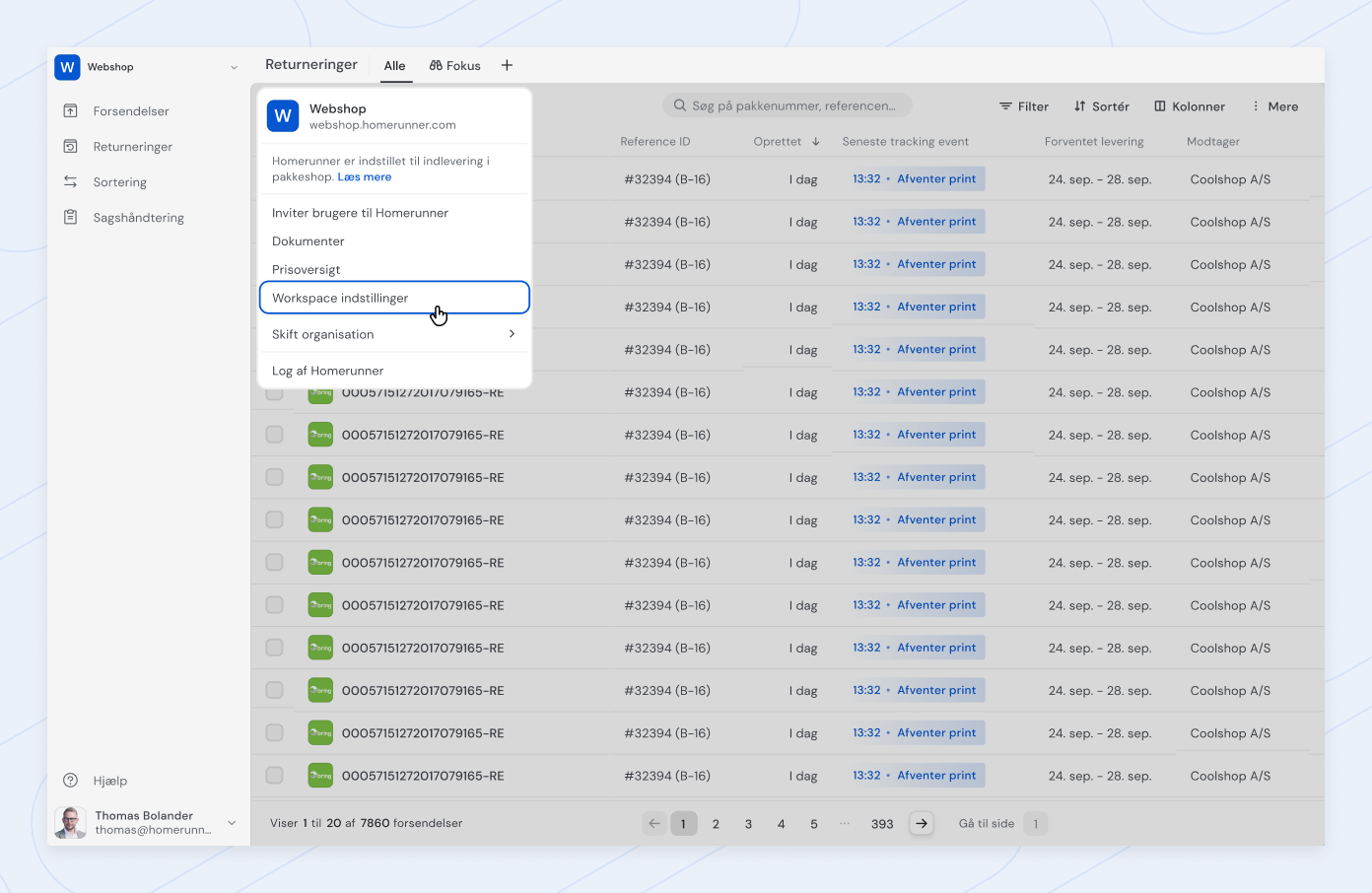 Retur: opret eller se alle jeres returforsendelser.